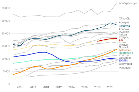 Η εξέλιξη του σταθμισμένου διάμεσου εισοδήματος ανά χώρα με αναγωγή σε αγοραστική δύναμη, από το 2013 μέχρι το 2022 (Ελλάδα 2022 10.841 μονάδες) φαίνεται εδώ: ←